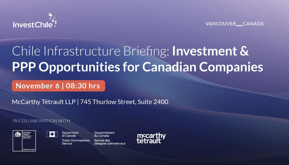 InvestChile, McCarthy Tétrault, the Canadian Trade Commissioner Service, and the Consulate General of Chile in Vancouver are organizing an exclusive investment briefing on Chile’s Infrastructure Market Opportunities, Port Infrastructure Development and Modernization Plans, to be held on Thursday, November 6th, from 08:30 to 10:30 AM, in Vancouver, Canada.