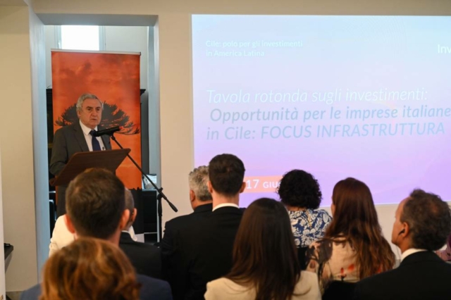El evento fue inaugurado por el embajador de Chile en Italia, Ennio Vivaldi, y el director general para la Promoción del Sistema País de Italia, Mauro Battocchi. También participaron Juan Eduardo Chackiel, jefe de la División de Estudios y Análisis Financiero de la Dirección General de Concesiones; y Francisca Müller, agregada de inversiones de InvestChile en Italia, así como autoridades del Ministerio de Infraestructura y Transporte de Italia y el vicepresidente de la Cámara Chilena de la Construcción, Orlando Sillano, quienes dialogaron sobre reformas, marcos regulatorios y oportunidades de cooperación.